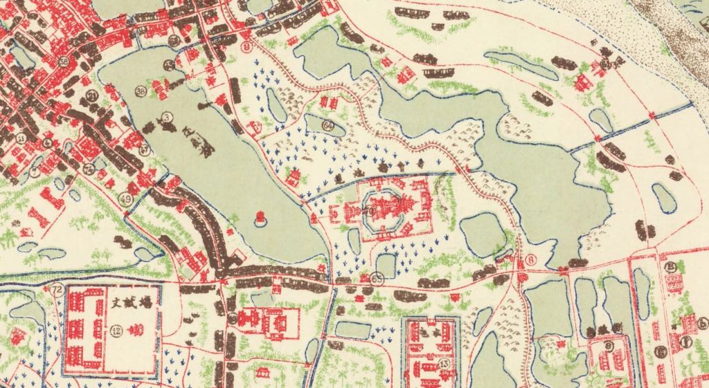 Phía trước lầu từng đặt ba khẩu thần công lớn bằng gang, nòng năm tấc, dài năm thước, được phong là Điện Xiết tướng quân, Lôi Chấn tướng quân và Phi Đằng tướng quân. Đời Gia Long, các quan Bắc thành cho lính di chuyển vào trong thành nhưng không tài nào nhổ lên được. Quan Đề đốc hộ thành phải cho sửa lễ cầu khẩn thần, lễ xong thì chuyển súng đi được ngay. Dân xung quanh thấy linh ứng liền lập miếu thờ. Đến đời Minh Mạng, người ta dựng một ngôi đền ngói và xin phong sắc để phụng sự, tuy nhiên đầu đời Thiệu Trị, quan thượng Nguyễn Đăng Giai xét lại không cho, bắt hủy đi và chính ông đứng ra xây dựng trên nền đất ấy ngôi chùa nguy nga đồ sộ — Chùa Báo Ân. Ông đặt tên chùa là Sùng Hưng Tự, tức chuộng sự hưng thịnh — cũng là điều ông gửi gắm và mong mỏi. Một điều thú vị nữa mà ít người biết được: ba khẩu thần công của Ngũ Long Lâu sau khi dời đi người dân dựng một miếu thờ nhỏ phía bên trái của chùa Báo Ân và được gọi là “Tam Cổ Phá Từ” (Chép theo nguyên bản, nhưng theo tôi có thể viết là “Tam Cổ Pháo Tự”) – Tiếng Pháp được gọi là “Pagode des trois canons”, có một lối nhỏ từ cổng phụ phía bên trái chùa Báo Ân dẫn thẳng ra phía miếu này. Xa hơn một chút về phía Nam là “Bảo Tuyền Cục” tức xưởng đúc tiền được vua Gia Long nhà Nguyễn dựng lên khoảng đầu năm 1800. Con phố nằm giữa Chùa Báo Ân và Bảo Tuyền Cục mang tên là Tràng Tiền cũng từ Bảo Tuyền Cục mà ra, dẫn thẳng ra Ô Cựu Lâu ( 1 trong 21 cửa ô của Hà Nội) là vị trí của Nhà Hát Lớn hiện nay. Chếch phía Tây Bắc sát cạnh Chùa Báo Ân là Phổ Giác Tự – tức chùa Tàu (chùa Tàu Tượng), xây dựng khoảng đầu năm 1400, là nơi huấn luyện voi ngày xưa – vốn nằm tại phường Phục Cổ (phía đông Hồ Gươm). Chùa Tàu được bắt đầu tháo dỡ từ năm 1883 và đến 1886 thì được di dời về phần đất của Thái Y Viện đời Hậu Lê nay là phố Ngô Sĩ Liên, Hà Nội.